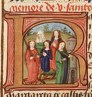 In een gehistorieerde initiaal staan vijf bekende vrouwelijke heiligen: op de eerste rij van links naar rechts Catharina met kroon, zwaard en het gebroken rad, Margaretha met de draak en Barbara met palmtak en toren. Op de tweede rij links de heilige Martha met hoofddoek, en rechts van haar Christina met gevouwen handen.